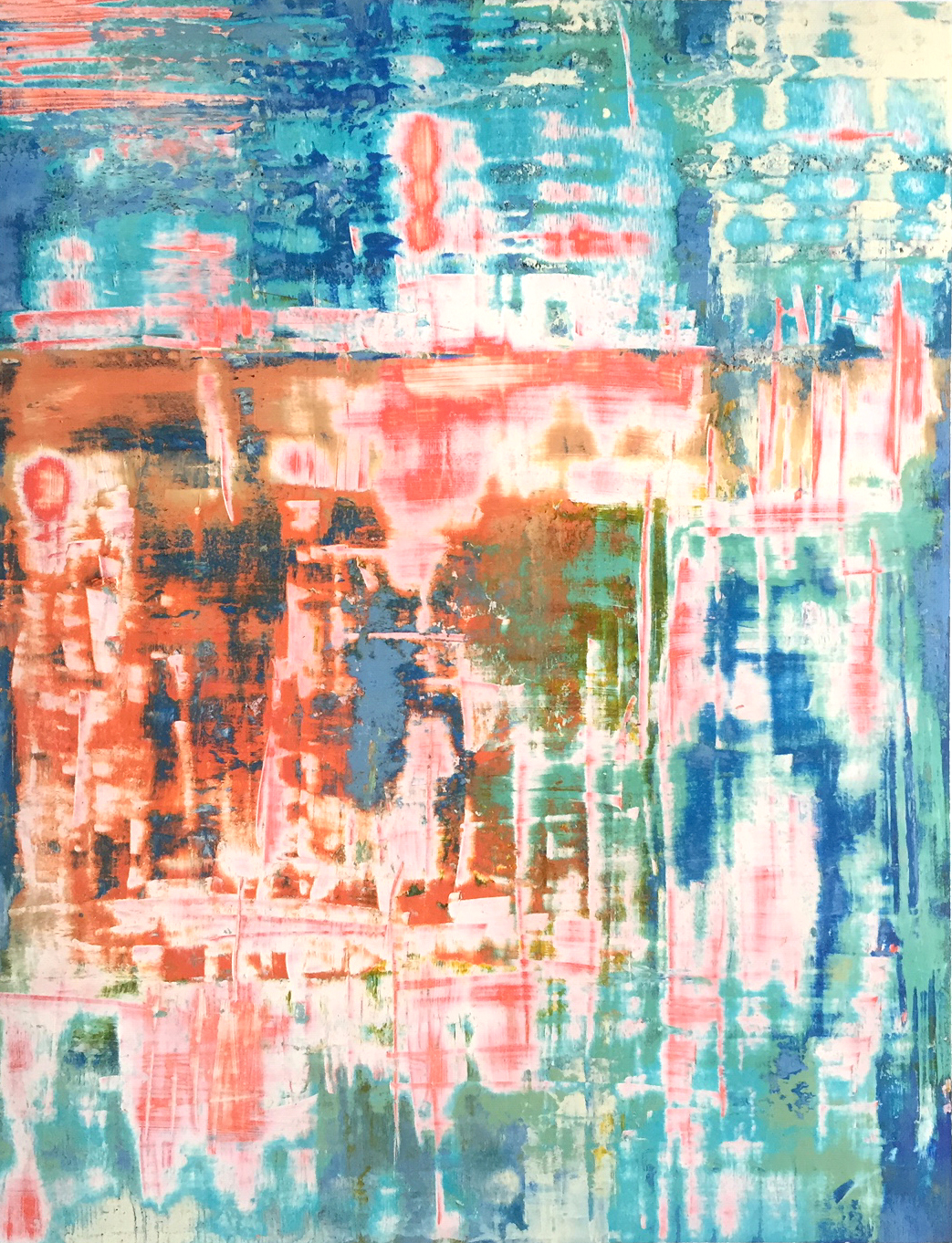 - Reflections 1, Oil and coldwax on Duralar, 9 x 11.5, framed 14.5 x 17.5