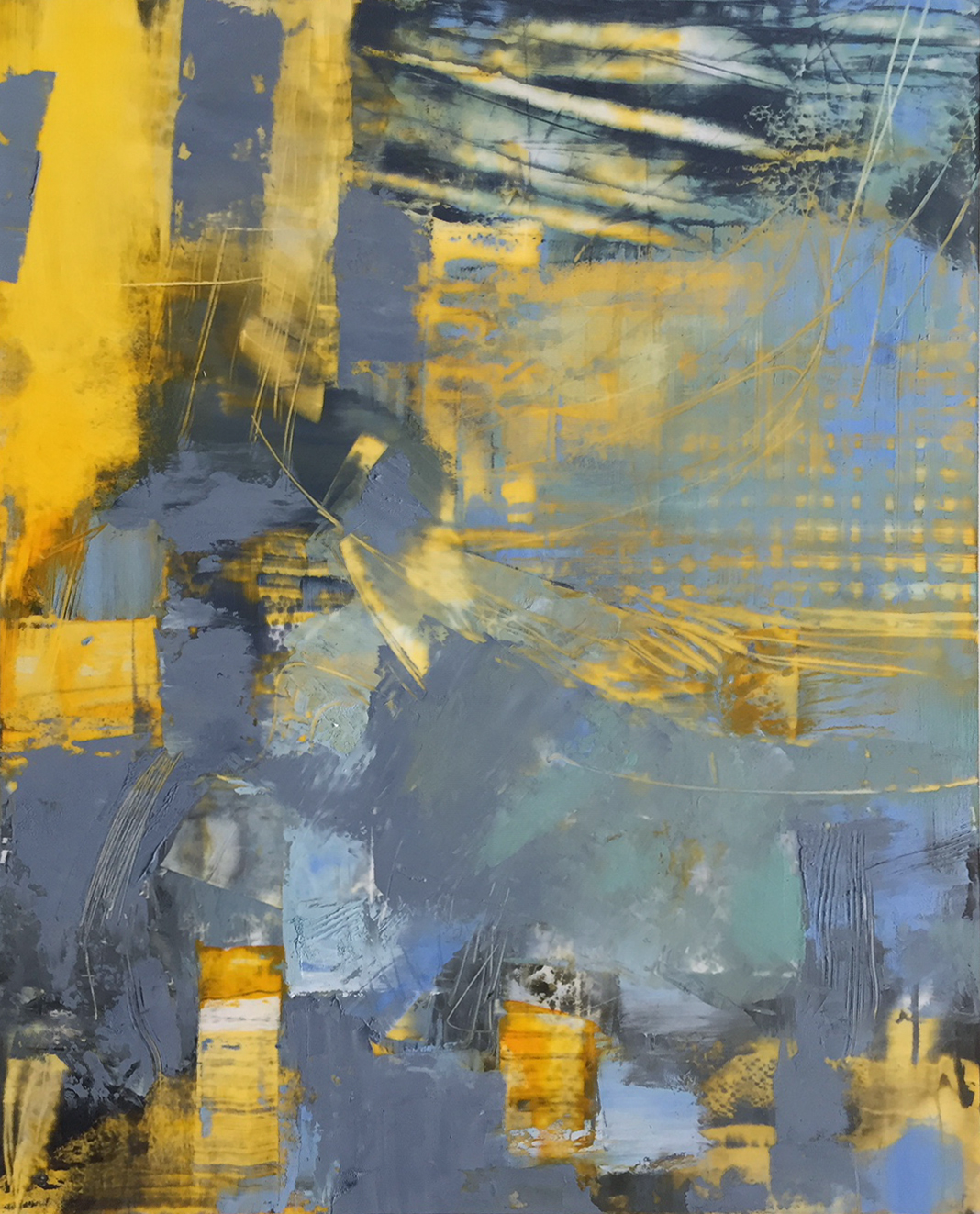 I had been wanting to explore other materials, and chose to take a leap and learn about working with oil and cold-wax. It was liberating to be out of my comfort zone. I found myself immersed in the experience — layering and scraping back, experimenting with texture and color, and reworking until something begins to emerge. Well into the process, I begin to get a sense of where the paintings were going.