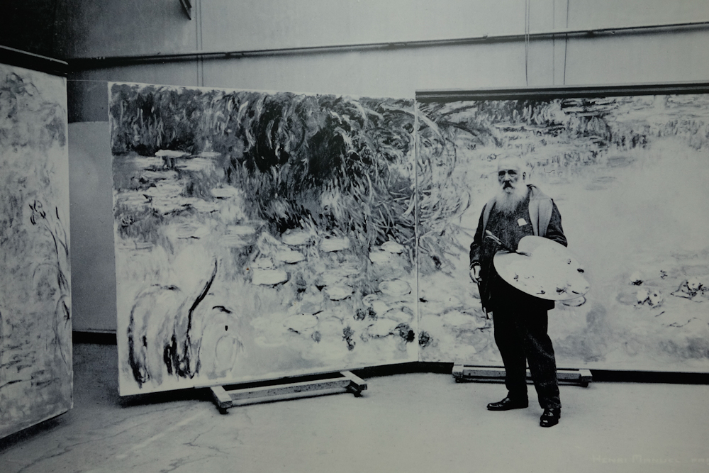 Monet in his studio, working on the paintings that would line the galleries of l’Orangerie Museum in Paris.