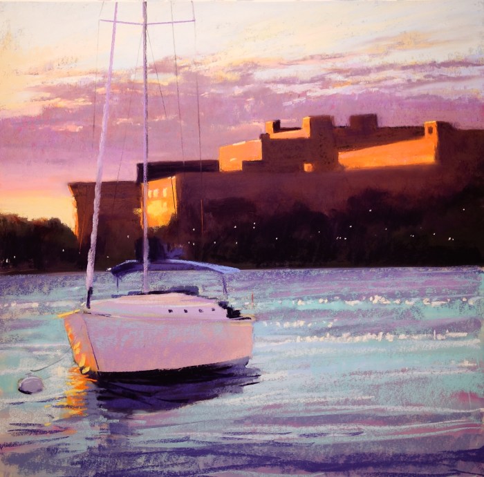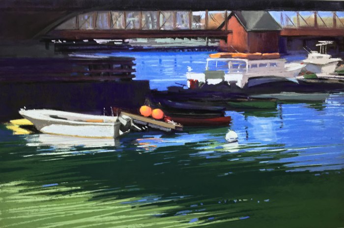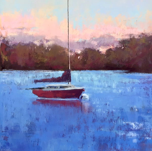 Boat series Last Light, 18×18 , PastelSOLDSailors Delight, 12×12Fort Point Bridge, 12×18Late Arrival SHYC, PastelSafe Harbor, 16 x18, SOLDLife is But a Dream, 9×12, PastelStill, 9×9 SOLDLow Tide Ipswich, 9×12